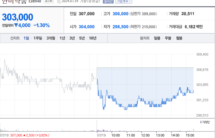 한미약품의 현재 주가는 303,000원으로 전일 대비 -4,000원 하락했습니다. 주주 현황을 살펴보면 한미사이언스(외 4인)이 지분의 50.57%를 소유하고 있습니다. 이 회사는 제약 기업으로 시가 총액은 3조8817억 원이며 발행 주식수는 12,810,991주입니다. 외국인 보유 비중은 18.91%이며 장중 거래량은 20,682주를 기록했습니다. 매출액은 4,037억 원을 달성했습니다.