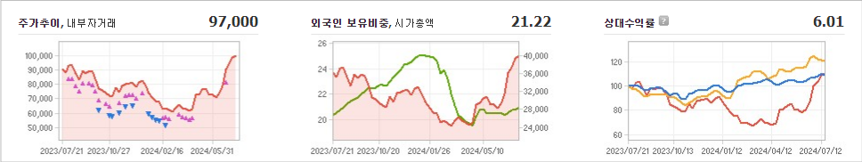 HD현대미포의 현재 주가는 97,000원으로 전일 대비 -3,400원 하락했습니다. 주주 구성을 살펴보면 에이치디한국조선해양(외 4인)이 지분의 42.85%를 보유하고 있습니다. HD현대미포는 조선 기업으로 시가 총액은 3조8744억 원이며 발행 주식수는 39,942,149주입니다. 외국인 보유 비중은 21.22%이며 장중 거래량은 338,404주를 기록했습니다. 또한, 매출액은 10,005억 원을 기록했습니다.