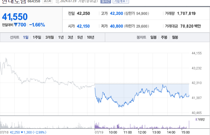 현대로템의 현재 주가는 41,550원이며 전일 대비 -700원 하락했습니다. 현대로템의 대주주인 현대자동차(외 3인)는 지분의 33.77%를 소유하고 있습니다. 이 회사는 운송인프라 기업으로, 시가 총액은 4조5349억 원이며 발행 주식수는 109,142,293주입니다. 외국인 보유 비중은 23.71%이며 장중 거래량은 1,730,184주를 기록했습니다. 또한 매출액은 7,478억 원을 기록했습니다.
